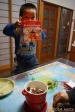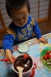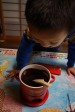 チョコレートを刻んで、融けるのを今か今かと待つ息子。