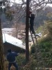 総代長自らチェーンソーを持ってハシゴに登り、
